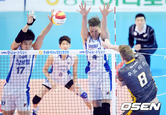1일 오후 대전 충무체육관서 열린 2016-2017 NH농협 V리그 남자부 대전 삼성화재와 구미 KB손해보험의 경기, 1세트 KB손해보험 우드리스의 공격을 삼성화재 손태훈-타이스가 블로킹하고 있다. / eastsea@osen.co.kr