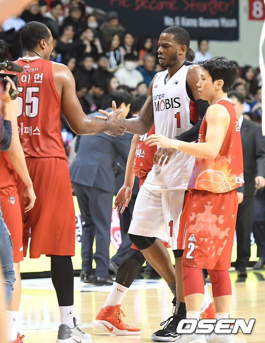 경기 종료 후 모비스 로드와 KGC 사이먼이 악수를 나누고 있다. / youngrae@osen.co.k