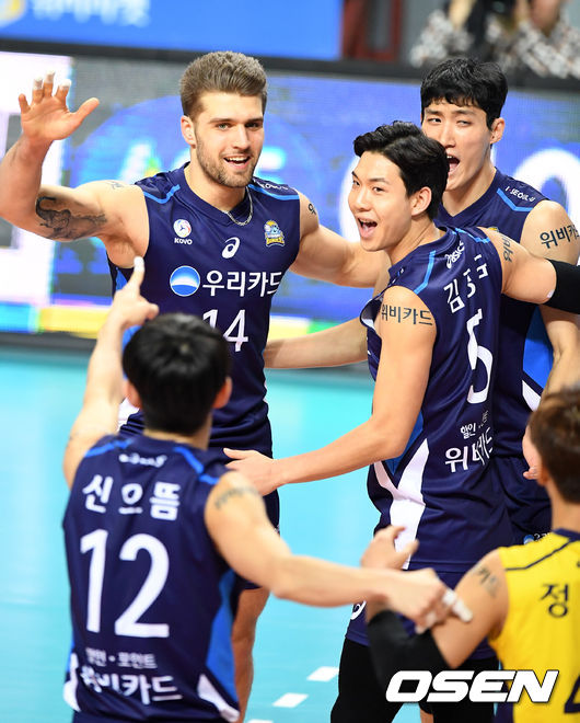 26일 서울 장충체육관에서 열린 '2016-2017 NH농협 V-리그' 남자부 우리카드와 OK저축은행의 경기, 2세트 우리카드 파다르가 블로킹 득점에 동료선수들과 기뻐하고 있다. /jpnews@osen.co.kr
