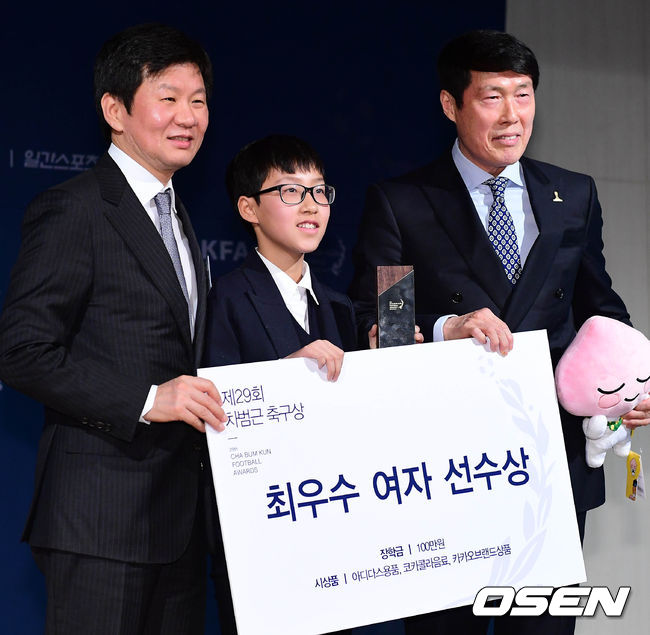 2일 오후 경기도 성남시 판교 스타트업 캠퍼스에서 열린 제29회 차범근 축구상에서 최우수여자선수상을 수상한 박수정(포항상대초)이 정몽규 대한축구협회 회장, 차범근과 기념촬영을 하고 있다. / baik@osen.co.kr