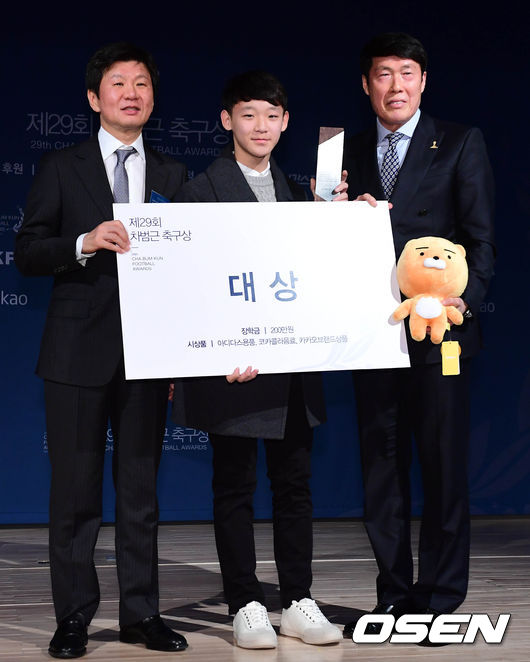 2일 오후 경기도 성남시 판교 스타트업 캠퍼스에서 열린 제29회 차범근 축구상에서 대상을 수상한 전유상(대동초)이 정몽규 대한축구협회 회장, 차범근과 기념촬영을 하고 있다. / baik@osen.co.kr