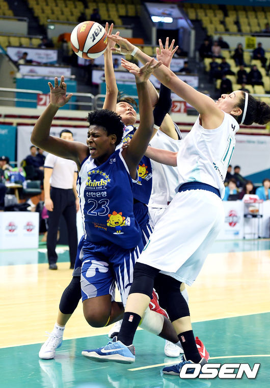 2일 오후 경기도 부천시 부천체육관에서 진행된 2016-2017 삼성생명 여자프로농구 KEB하나은행과 신한은행의 경기, 2쿼터 신한은행 윌리엄즈-KEB하나은행 어천와가 리바운드 경쟁을 펼치고 있다. / eastsea@osen.co.kr