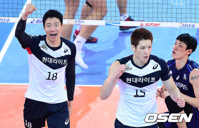 2일 오후 충남 천안시 유관순체육관에서 열린 2016-2017 NH농협 V-리그 현대캐피탈과 우리카드의 경기 2세트 현대캐피탈 득점 상황, 신영석과 문성민이 기뻐하고 있다. / baik@osen.co.kr