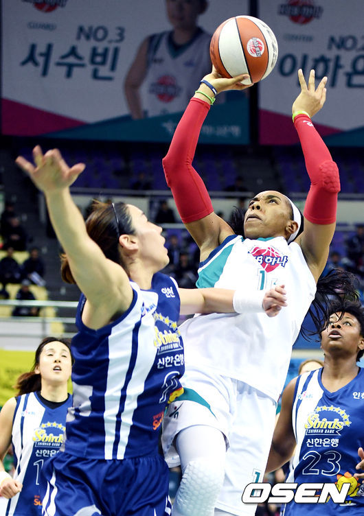 2일 오후 경기도 부천시 부천체육관에서 진행된 2016-2017 삼성생명 여자프로농구 KEB하나은행과 신한은행의 경기, 3쿼터 KEB하나은행 쏜튼이 골밑 슛을 시도하고 있다. / eastsea@osen.co.kr