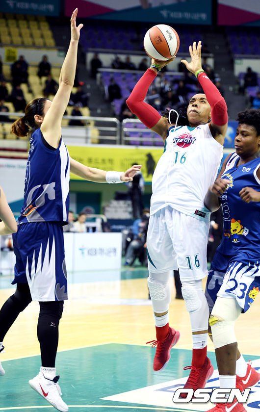 2일 오후 경기도 부천시 부천체육관에서 진행된 2016-2017 삼성생명 여자프로농구 KEB하나은행과 신한은행의 경기, 4쿼터 KEB하나은행 쏜튼이 골밑 슛을 시도하고 있다. / eastsea@osen.co.kr