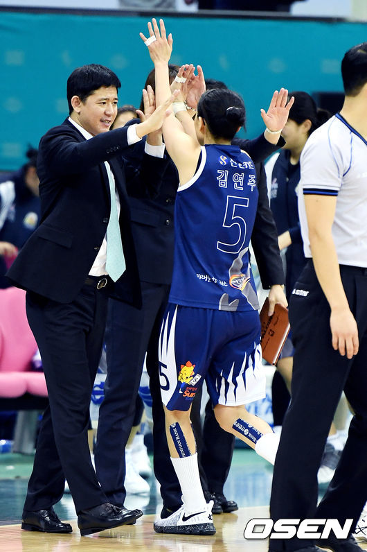 2일 오후 경기도 부천시 부천체육관에서 진행된 2016-2017 삼성생명 여자프로농구 KEB하나은행과 신한은행의 경기, 4쿼터 신한은행 신기성 감독이 선수들과 하이파이브 하고 있다. / eastsea@osen.co.kr