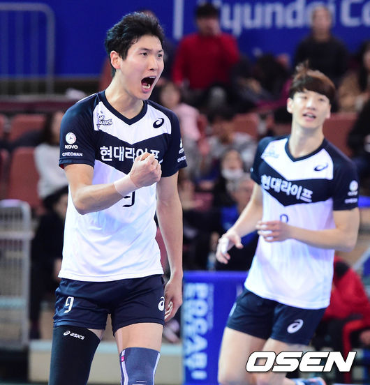 2일 오후 충남 천안시 유관순체육관에서 열린 2016-2017 NH농협 V-리그 현대캐피탈과 우리카드의 경기 5세트 현대캐피탈 득점 상황, 박주형이 환호하고 있다. / baik@osen.co.kr