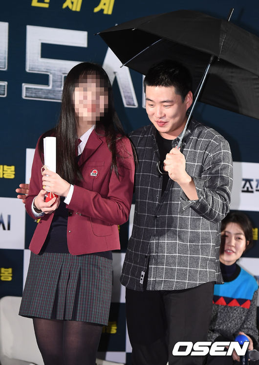 배우 안재홍이 2일 오후 서울 삼성동 코엑스 메가박스에서 진행된 영화 '조작된 도시' 쇼케이스에 참석해 이벤트에 당첨된 여성팬과 기념촬영을 하고 있다. / youngrae@osen.co.kr