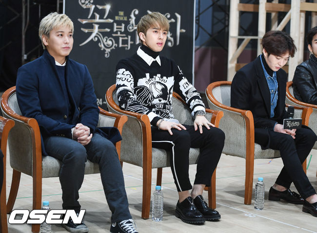 8일 오전 서울 종로구 연지동 대호주차장 내 연지홀에서 진행된 뮤지컬 '꽃보다 남자'연습실 공개에서 비투비 창섭과 빅스 켄, 슈퍼주니어 성민이 질문을 듣고 있다. / soul1014@osen.co.kr