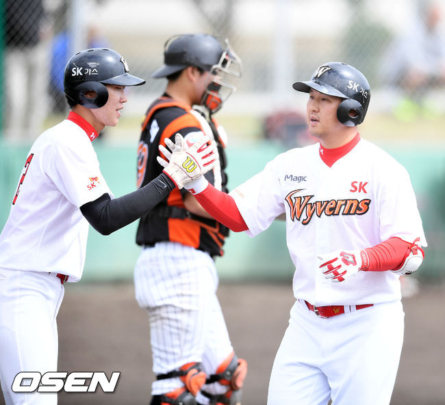 3일 일본 오키나와 구시카와 구장에서 열린 SK 와이번스와 롯데 자이언츠의 연습경기에서 2회말 2사 주자 만루 SK 최정이 좌월 만루 홈런을 날린 후 홈을 밟고 있다./ rumi@osen.co.kr