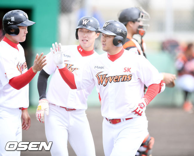 3일 일본 오키나와 구시카와 구장에서 열린 SK 와이번스와 롯데 자이언츠의 연습경기에서 2회말 2사 주자 만루 SK 최정이 좌월 만루 홈런을 날린 후 홈을 밟고 있다./ rumi@osen.co.kr