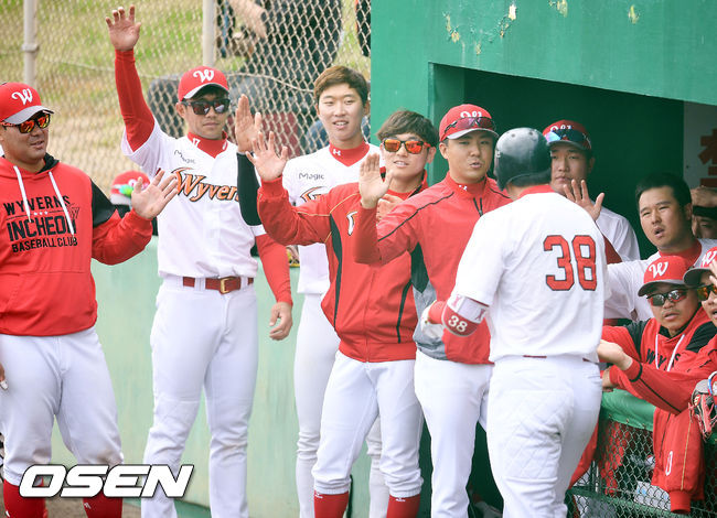 3일 일본 오키나와 구시카와 구장에서 열린 SK 와이번스와 롯데 자이언츠의 연습경기에서 2회말 1사 2루 SK 김동엽이 롯데 선발 박시영을 상대로 역전 중월 투런 홈런을 날린 후 덕아웃에서 동료들과 하이파이브를 하고 있다./ rumi@osen.co.kr