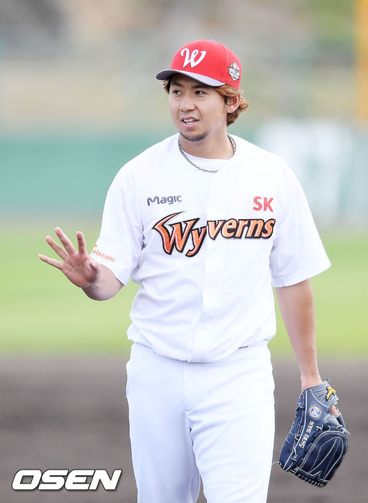 3일 일본 오키나와 구시카와 구장에서 열린 SK 와이번스와 롯데 자이언츠의 연습경기에서 2회를 마친 SK 선발 윤희상이 사인을 보내고 있다./ rumi@osen.co.kr