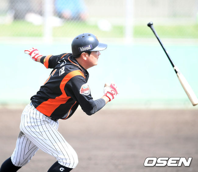3일 일본 오키나와 구시카와 구장에서 열린 SK 와이번스와 롯데 자이언츠의 연습경기에서 5회초 롯데 선두타자 문규현이 중전 안타를 날리고 있다./ rumi@osen.co.kr