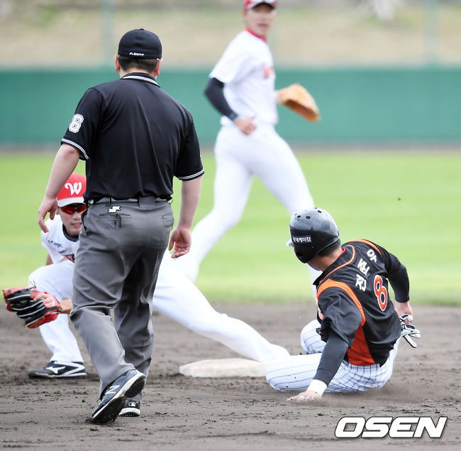 3일 일본 오키나와 구시카와 구장에서 열린 SK 와이번스와 롯데 자이언츠의 연습경기에서 5회초 2사 주자 1루 롯데 나경민 타석에서 1루 주자 전준우가 2루 도루를 시도했으나 실패하고 있다./ rumi@osen.co.kr