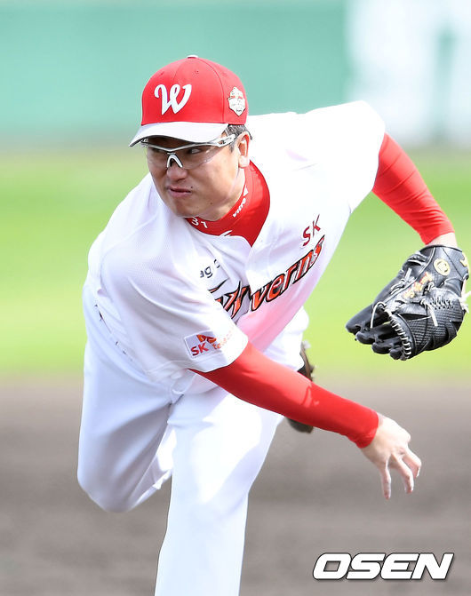 3일 일본 오키나와 구시카와 구장에서 열린 SK 와이번스와 롯데 자이언츠의 연습경기에서 4회초 1사 SK 정영일이 팔꿈치 고통을 호소하며 교체된 후 마운드에 오른 SK 전유수가 힘차게 공을 뿌리고 있다./ rumi@osen.co.kr