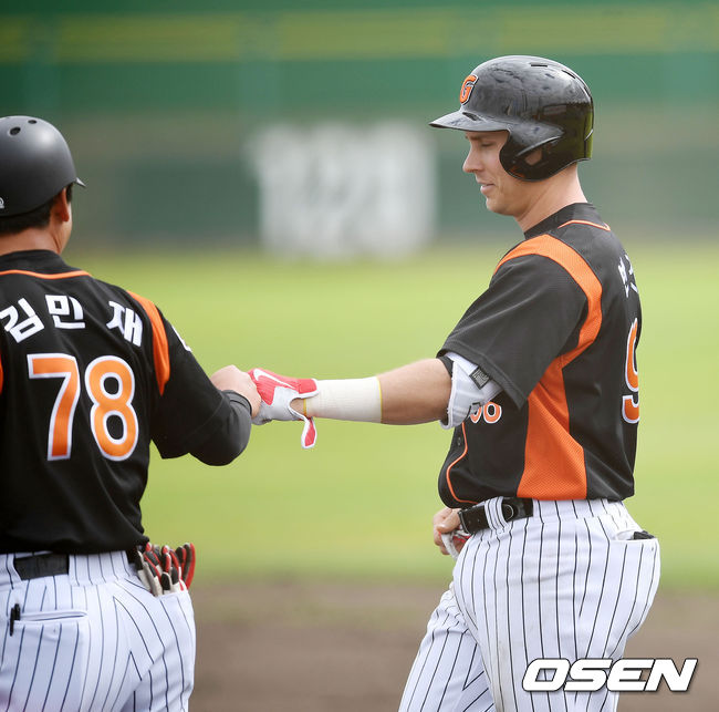 3일 일본 오키나와 구시카와 구장에서 열린 SK 와이번스와 롯데 자이언츠의 연습경기에서 6회초 1사 롯데 번즈가 내야 안타를 날린 후 1루에서 기뻐하고 있다./ rumi@osen.co.kr