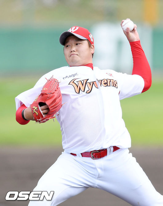 3일 일본 오키나와 구시카와 구장에서 열린 SK 와이번스와 롯데 자이언츠의 연습경기에서 6회초 2사 주자 1,2루 롯데 김문호 타석에서 마운드에 오른 SK 김태훈이 힘차게 공을 뿌리고 있다./ rumi@osen.co.kr