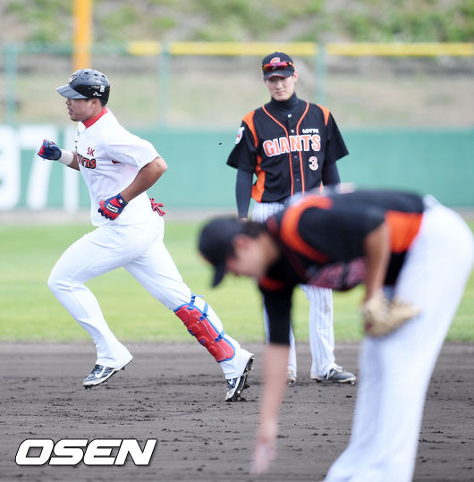 3일 일본 오키나와 구시카와 구장에서 열린 SK 와이번스와 롯데 자이언츠의 연습경기에서 8회말 2사 SK 한동민이 우월 솔로 홈런을 날린 후 그라운드를 돌고 있다./ rumi@osen.co.kr
