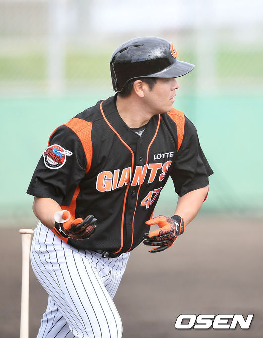 3일 일본 오키나와 구시카와 구장에서 열린 SK 와이번스와 롯데 자이언츠의 연습경기에서 9회초 2사에 타석에 오른 롯데 강민호가 플라이 타구를 날리며 경기가 끝나고 있다./ rumi@osen.co.kr
