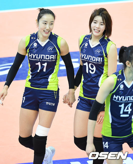 3일 오후 경기도 수원시 수원실내체육관서 펼쳐진 2016-2017 NH농협 V리그 여자부 현대건설과 흥국생명의 경기,1세트 승리한 현대건설 한유미와 이다영이 미소 지으며 코트를 이동하고 있다. / soul1014@osen.co.kr