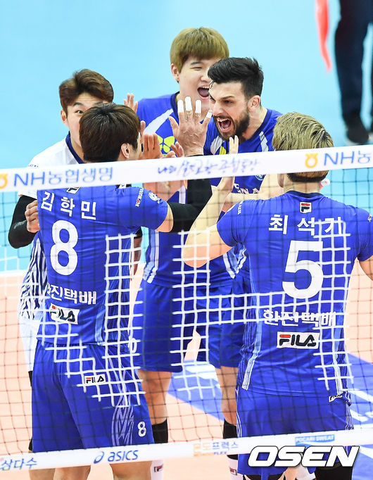 3일 오후 경기도 수원시 수원실내체육관서 펼쳐진 2016-2017 NH농협 V리그 남자부 한국전력과 대한항공의 경기,1세트 멋진 디그를 보인 대한항공 가스파리니가 김학민의 득점 후 기뻐하고 있다. / soul1014@osen.co.kr