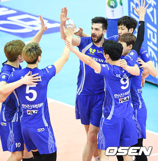 3일 오후 경기도 수원시 수원실내체육관서 펼쳐진 2016-2017 NH농협 V리그 남자부 한국전력과 대한항공의 경기,1세트 승리한 대한항공 선수들이 기뻐하고 있다. / soul1014@osen.co.kr
