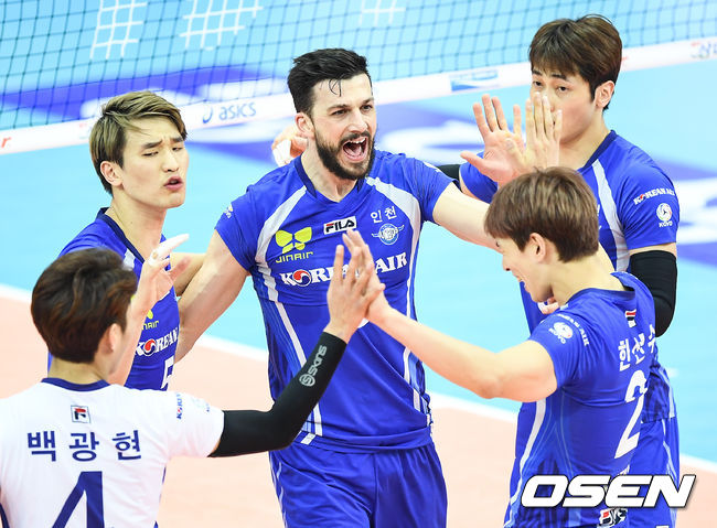 3일 오후 경기도 수원시 수원실내체육관서 펼쳐진 2016-2017 NH농협 V리그 남자부 한국전력과 대한항공의 경기,1세트 승리한 대한항공 선수들이 기뻐하고 있다. / soul1014@osen.co.kr