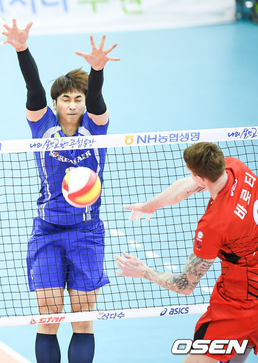 3일 오후 경기도 수원시 수원실내체육관서 펼쳐진 2016-2017 NH농협 V리그 남자부 한국전력과 대한항공의 경기,1세트 대한항공 김학민이 블로킹 성공하고 있다. / soul1014@osen.co.kr
