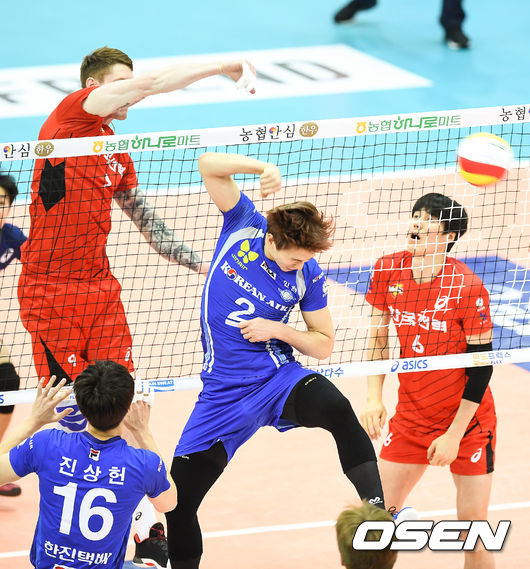 3일 오후 경기도 수원시 수원실내체육관서 펼쳐진 2016-2017 NH농협 V리그 남자부 한국전력과 대한항공의 경기,1세트 한국전력 바로티의 강타때 대한항공 한선수가 깜짝 놀라고 있다. / soul1014@osen.co.kr