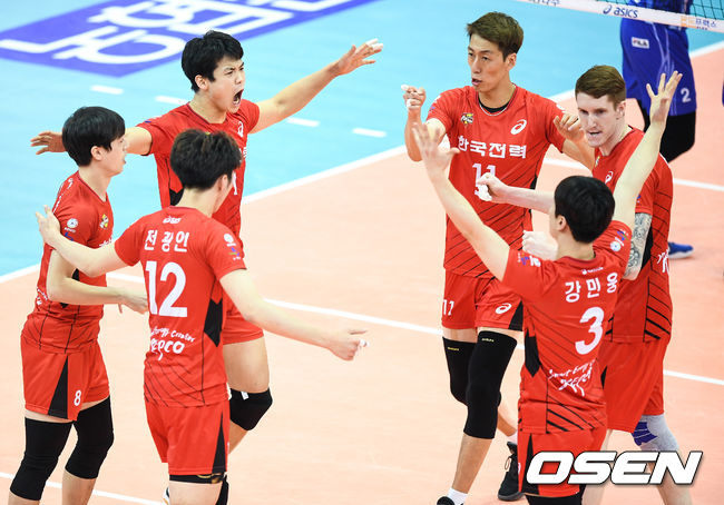 3일 오후 경기도 수원시 수원실내체육관서 펼쳐진 2016-2017 NH농협 V리그 남자부 한국전력과 대한항공의 경기,4세트 한국전력 전광인의 득점때 한국전력 선수들이 기뻐하고 있다. / soul1014@osen.co.kr