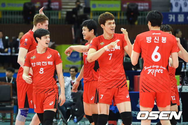3일 오후 경기도 수원시 수원실내체육관서 펼쳐진 2016-2017 NH농협 V리그 남자부 한국전력과 대한항공의 경기,4세트 한국전력 전광인의 득점때 한국전력 전광인이 동료들과 신영철 감독과 기뻐하고 있다. / soul1014@osen.co.kr