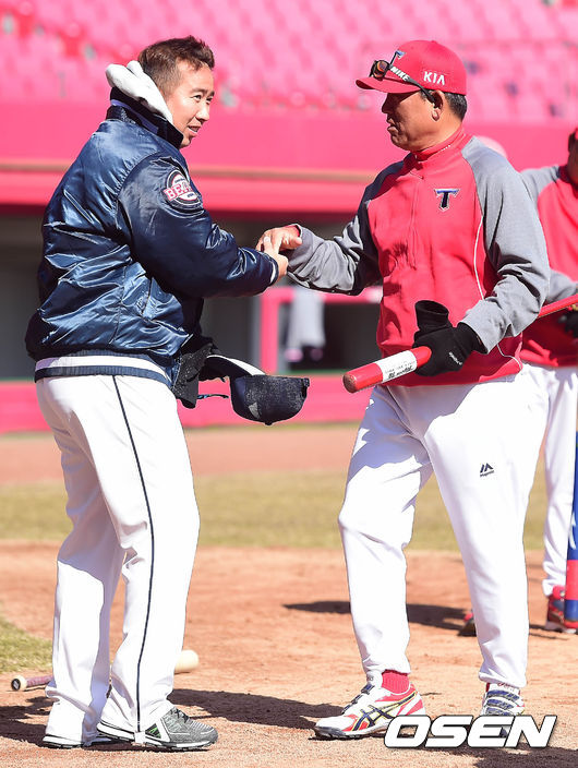 14일 광주광역시 KIA 챔피언스 필드에서 열리는 2017 KBO 리그 시범경기 KIA 타이거즈와 두산 베어스의 경기 시작전 유희관과 조계현 코치가 인사를 나누고 있다. / baik@osen.co.kr