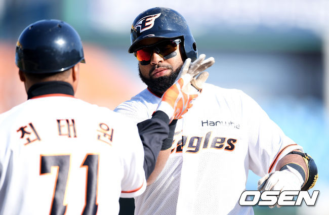 14일 오후 대전 한화생명 이글스파크에서 열린 '2017 타이어뱅크 KBO 리그' 한화 이글스와 LG 트윈스의 시범경기, 7회말 2사 2루 한화 로사리오가 1타점 적시타를 때리고 최태원 코치와 하이파이브 하고 있다. / eastsea@osen.co.kr