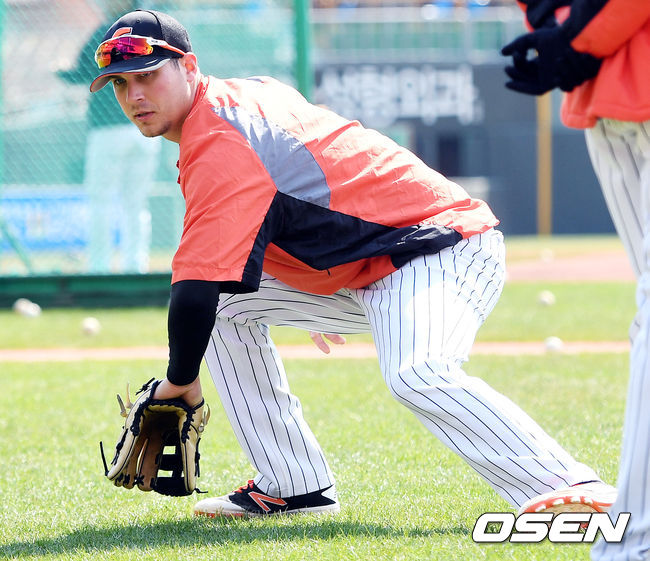 15일 부산 사직야구장에서 '2017 프로야구' 롯데 자이언츠와 SK 와이번스의 시범경기가 열릴 예정인 가운데 롯데 번즈가 수비 훈련을 하고 있다. / eastsea@osen.co.kr