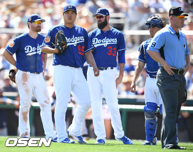 3회초 무사 1루 밀워키 가르자의 타석, 다저스의 수비 시프트때 1루심이 다저스 더그아웃을 향해 주의를 주자 다저스 로버츠 감독이 항의했다. 1루심은 수비 시프트로 2루수가 1루 수비로 들어갈때 1루수 미트를 착용해야 한다는 규칙을 내세웠다. 경기가 중단되자 류현진이 마음을 가다듬고 있다. / soul1014@osen.co.kr