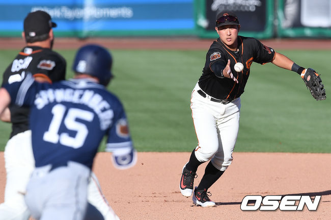 25일 오후 미국 애리조나주 스캇데일 스타디움에서 진행된 2017 메이저리그(MLB) 시범경기 샌프란시스코 자이언츠와 샌디에이고 파드리스의 경기,7회초 1루수 교체 출전한 황재균이 샌디에이고 선두타자 사디나스의 타구를 잡아낸뒤 토수하고 있다. / soul1014@osen.co.kr