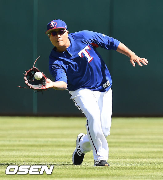 3일 오후(현지시간) 미국 텍사스주 알링턴 글로브 라이브 파크에서 열린 2017 메이저리그(MLB) 텍사스 레인저스와 클리블랜드 인디언스의 개막전 경기에 앞서 추신수가 외야수비훈련을 하고 있다. / soul1014@osen.co.kr