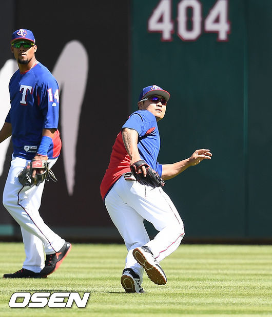 3일 오후(현지시간) 미국 텍사스주 알링턴 글로브 라이브 파크에서 열린 2017 메이저리그(MLB) 텍사스 레인저스와 클리블랜드 인디언스의 개막전 경기에 앞서 추신수가 외야수비훈련을 하고 있다. / soul1014@osen.co.kr