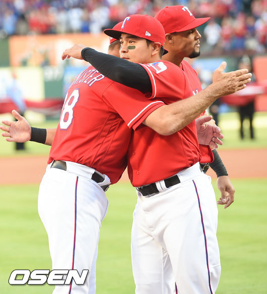 3일 오후(현지시간) 미국 텍사스주 알링턴 글로브 라이브 파크에서 열린 2017 메이저리그(MLB) 텍사스 레인저스와 클리블랜드 인디언스의 개막전, 추신수가 배니스터 감독과 포옹을 하고 있다./ soul1014@osen.co.kr