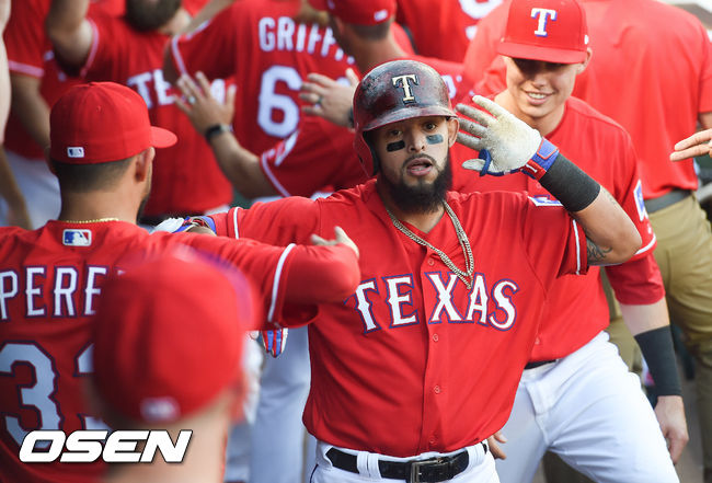 3일 오후(현지시간) 미국 텍사스주 알링턴 글로브 라이브 파크에서 열린 2017 메이저리그(MLB) 텍사스 레인저스와 클리블랜드 인디언스의 개막전,3회말 1사 1,2루 오도어가 3점홈런을 날리고 기뻐하고 있다오도어는 2회말 솔로홈런을 기록했다. / soul1014@osen.co.kr
