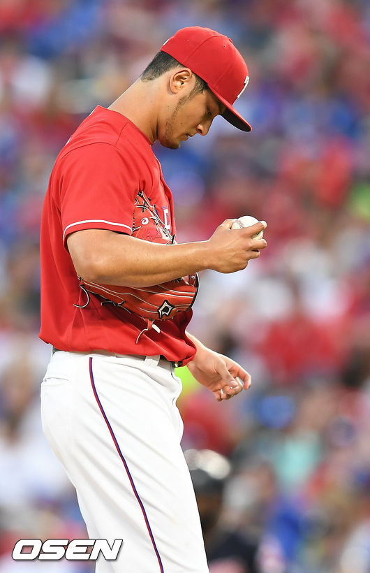 3일 오후(현지시간) 미국 텍사스주 알링턴 글로브 라이브 파크에서 열린 2017 메이저리그(MLB) 텍사스 레인저스와 클리블랜드 인디언스의 개막전,5회말 무사 만루위기를 맞은 다르빗슈 유가 공을 매만지고 있다./ soul1014@osen.co.kr