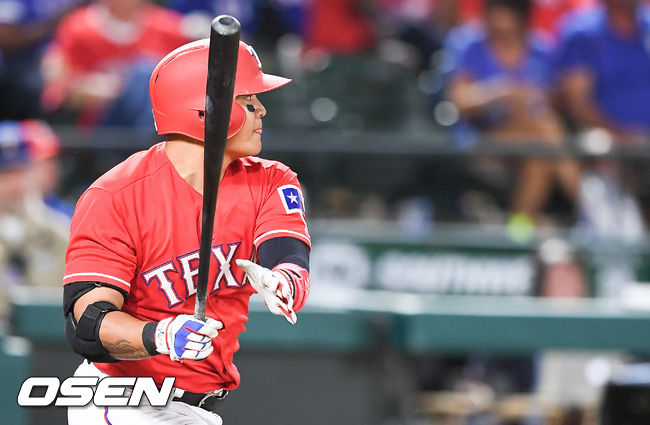3일 오후(현지시간) 미국 텍사스주 알링턴 글로브 라이브 파크에서 열린 2017 메이저리그(MLB) 텍사스 레인저스와 클리블랜드 인디언스의 개막전,7회말 2사 추신수가 안타를 날리고 있다./ soul1014@osen.co.kr