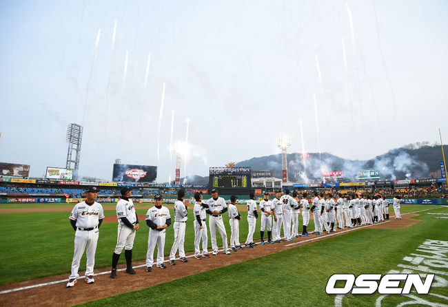 4일 대전 한화생명이글스파크에서 열린 '2017 타이어뱅크 KBO 리그' 한화 이글스와 NC 다이노스의 경기서, 한화 홈 개막전 축하 불꽃쇼가 진행되고 있다. / rumi@osen.co.kr