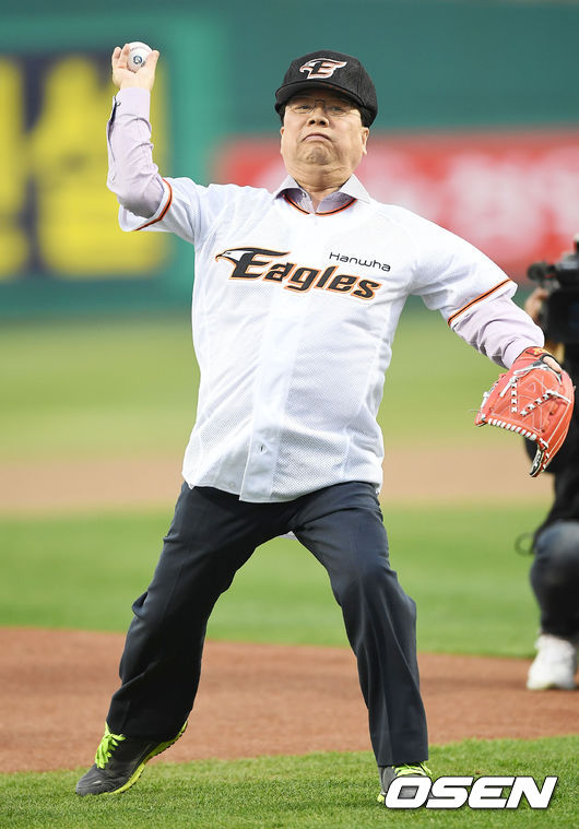 4일 대전 한화생명이글스파크에서 열린 '2017 타이어뱅크 KBO 리그' 한화 이글스와 NC 다이노스의 경기서, 권선택 대전 시장이 시구를 하고 있다. / rumi@osen.co.kr