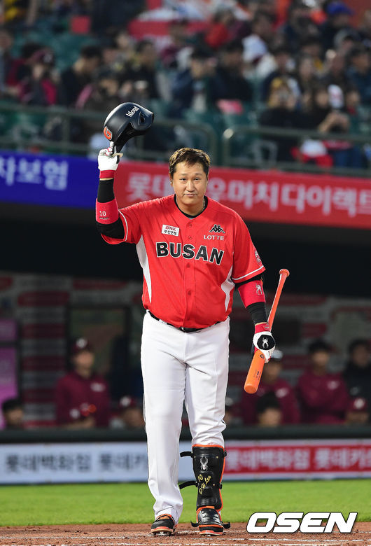 4일 오후 부산 사직야구장에서 열린 '2017 타이어뱅크 KBO 리그' 롯데 자이언츠와 넥센 히어로즈의 경기 1회말 1사 2루 이대호가 타석에 들어서며 팬들에게 인사를 하고 있다. / baik@osen.co.kr