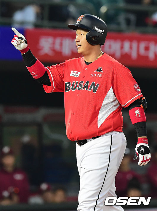 4일 오후 부산 사직야구장에서 열린 '2017 타이어뱅크 KBO 리그' 롯데 자이언츠와 넥센 히어로즈의 경기 1회말 1사 2루 이대호가 투런홈런을 치고 홈을 밟으며 세레머니를 하고 있다. / baik@osen.co.kr