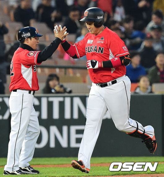 4일 오후 부산 사직야구장에서 열린 '2017 타이어뱅크 KBO 리그' 롯데 자이언츠와 넥센 히어로즈의 경기 1회말 1사 2루 이대호가 투런홈런을 치고 3루 코치와 하이파이브를 하고 있다. / baik@osen.co.kr
