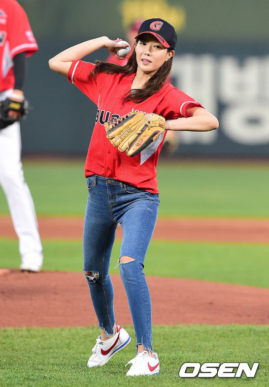 4일 오후 부산 사직야구장에서 열린 '2017 타이어뱅크 KBO 리그' 롯데 자이언츠와 넥센 히어로즈의 경기 시작전 임수향이 시구를 하고 있다. / baik@osen.co.kr