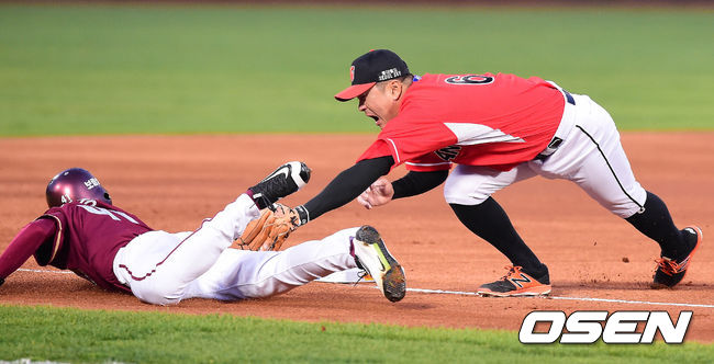 4일 오후 부산 사직야구장에서 열린 '2017 타이어뱅크 KBO 리그' 롯데 자이언츠와 넥센 히어로즈의 경기 1회초 2사 1,2루 채태인의 내야안타 상황, 2루주자 이정후가 홈까지 달리다 3루로 귀루하며 문규현에게 태그아웃 당하고 있다. / baik@osen.co.kr
